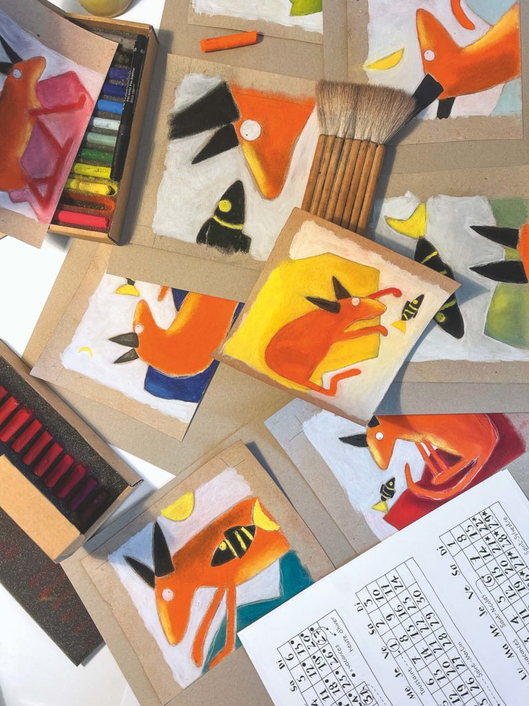 Tous ces dessins et ces lettres ont ensuite été numérisés et travaillés sur ordinateur par Raphaël Donnat, de Scan Graphic à Nyon. Il a fait en sorte que les lumineux pastels utilisés sur papier soient aussi éclatants sur écran… puis à l’impression!