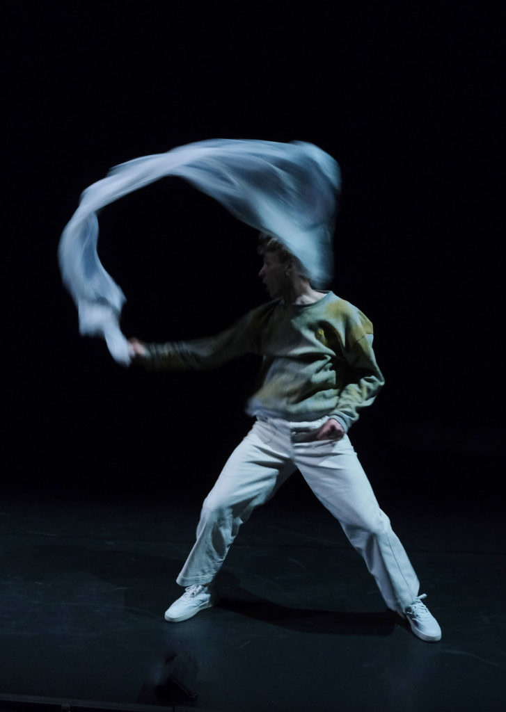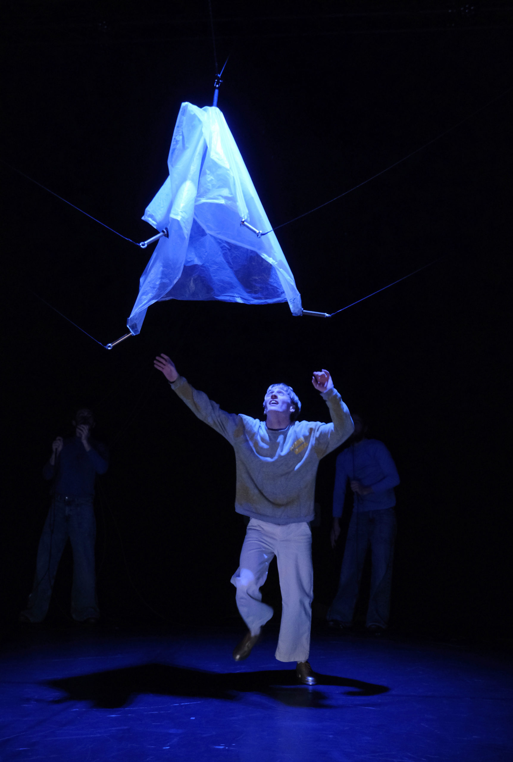 Nous sommes à la conjonction d’un théâtre d’objets et d’une danse qui s’appuie toujours sur des situations très concrètes, où les mots sont rares et les images étonnantes. Après le dispositif magique d’Hocus Pocus, nous continuons d’explorer ce lien des corps avec un décor, ici en constante transformation. Ce sont des bâches de toutes natures qui sont employées, jouant avec l’air, manipulées, prenant une multitude de formes évocatrices, dans une sorte d’artisanat de l’imaginaire, offrant aux personnages les situations dans lesquelles ils vont évoluer.