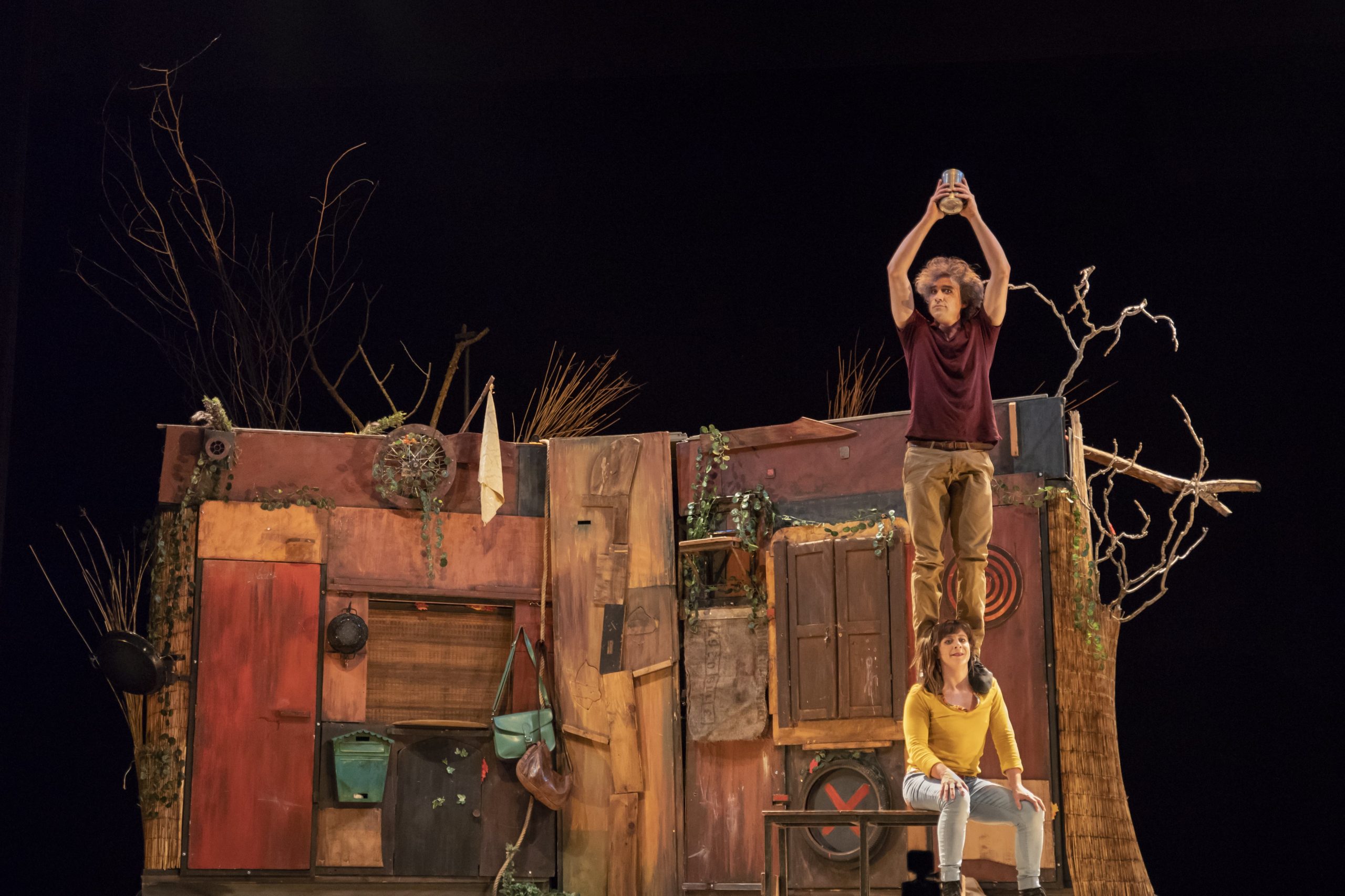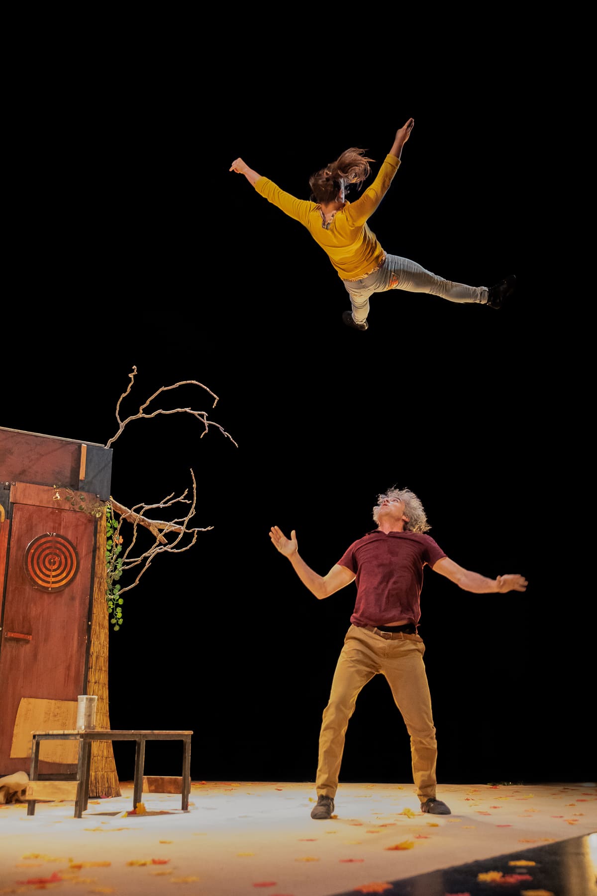 Acrobates, funambules, trapézistes… les deux artistes de cette compagnie andalouse mettent tous leurs talents au service du récit touchant de ces retrouvailles.